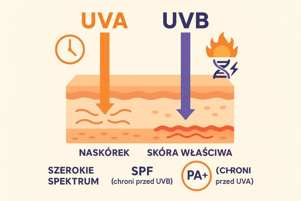To jednak tylko część układanki. Dociera do nas także promieniowanie UVA – aż 95% całego UV. Działa cały rok, przenika głęboko w skórę i przyspiesza starzenie. Na opakowaniach szukaj oznaczeń PA (z plusami) lub UVA w kółeczku, a także informacji „broad spectrum”. Im więcej plusów przy PA, tym wyższa ochrona przed UVA. Takie produkty chronią zarówno przed UVB, jak i UVA.